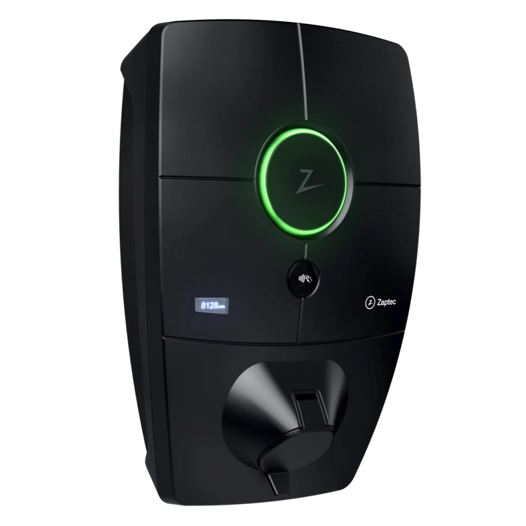 Svart Zaptec Go-elbillader montert på garasjevegg